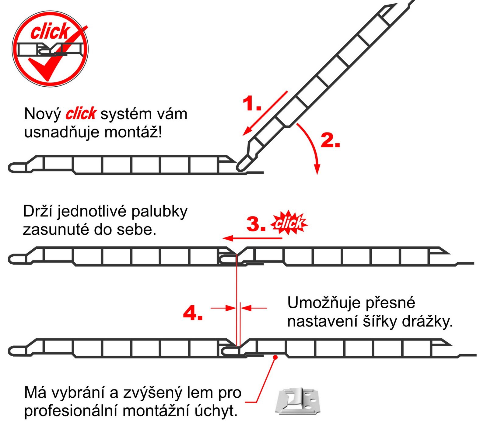 Palubky P530 se do sebe navzájem zasunují systémem pero-drážka s Click systémem a přiznané spoje vytváří takzvaný "klasický profil" s "V" drážkou. Skladebná šířka je 10 cm.