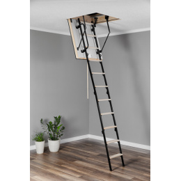 Protipožární schody jsou s kombinovaným 4 -dílným žebříkem, kde stupně jsou dřevěné a bočnice kovové. Zesíleného dřevěného rámu o výšce 170 mm, protipožárního víka a vlastního žebříku. Protipožární víko má izolaci silnou 40mm to je opatřeno oboustranně bílou MDF deskou. Víko je opatřeno dvojitým falcem s celoobvodovým těsněním, bránící šíření kouře. Na víku je namontován složený třídílný žebřík. Protipožární schody jsou opatřeny párem ocelových pružin, které drží žebřík při otevírání a napomáhají při zavírání. Sočástí balení je madlo pro snadnější výstup a plastové stopky pro ochranu povrchu. Nosnost schodů je 160 kg. Schody jsou pro výšku podlaží 2,65m.